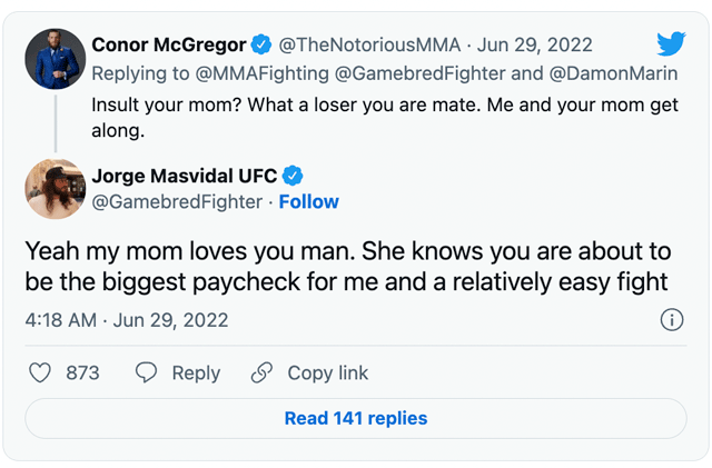 Gisteren reageerde McGregor dan eindelijk op Masvidal op geheel eigen wijze. ,,Je moeder beledigen? Wat een loser ben jij maat. Ik en je moeder kunnen goed met elkaar overweg", zei McGregor in reactie op Masvidal. Die later ook weer van zich liet horen. ,,Ja, mijn moeder houdt van je man. Ze weet dat je op het punt staat het grootste salaris voor mij te worden en een relatief makkelijk gevecht", aldus Masvidal.
