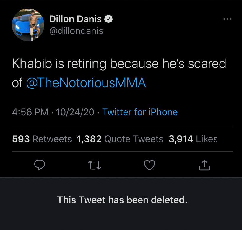 Khabib versloeg zaterdag Justin Gaethje tijdens UFC 254, Danis probeerde echter het moment te kapen en schreef: "Khabib gaat met pensioen omdat hij bang is voor Conor McGregor". Toch verwijderde hij deze Tweet snel nadat hij zich realiseerde dat hij te ver was gegaan.