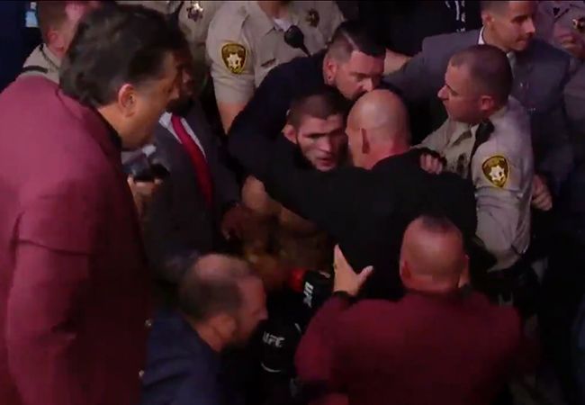 Khabib versloeg via submissie McGregor, om dit te vieren en zijn gelijk te bewijzen gooide Khabib zijn bitje door de kooi heen naar uitdagen de Ierse fans. Deze daagde hem uit om te komen vechten. Zo geschiedde Khabib vloog over de rand van de kooi het publiek in en de hel brak los.